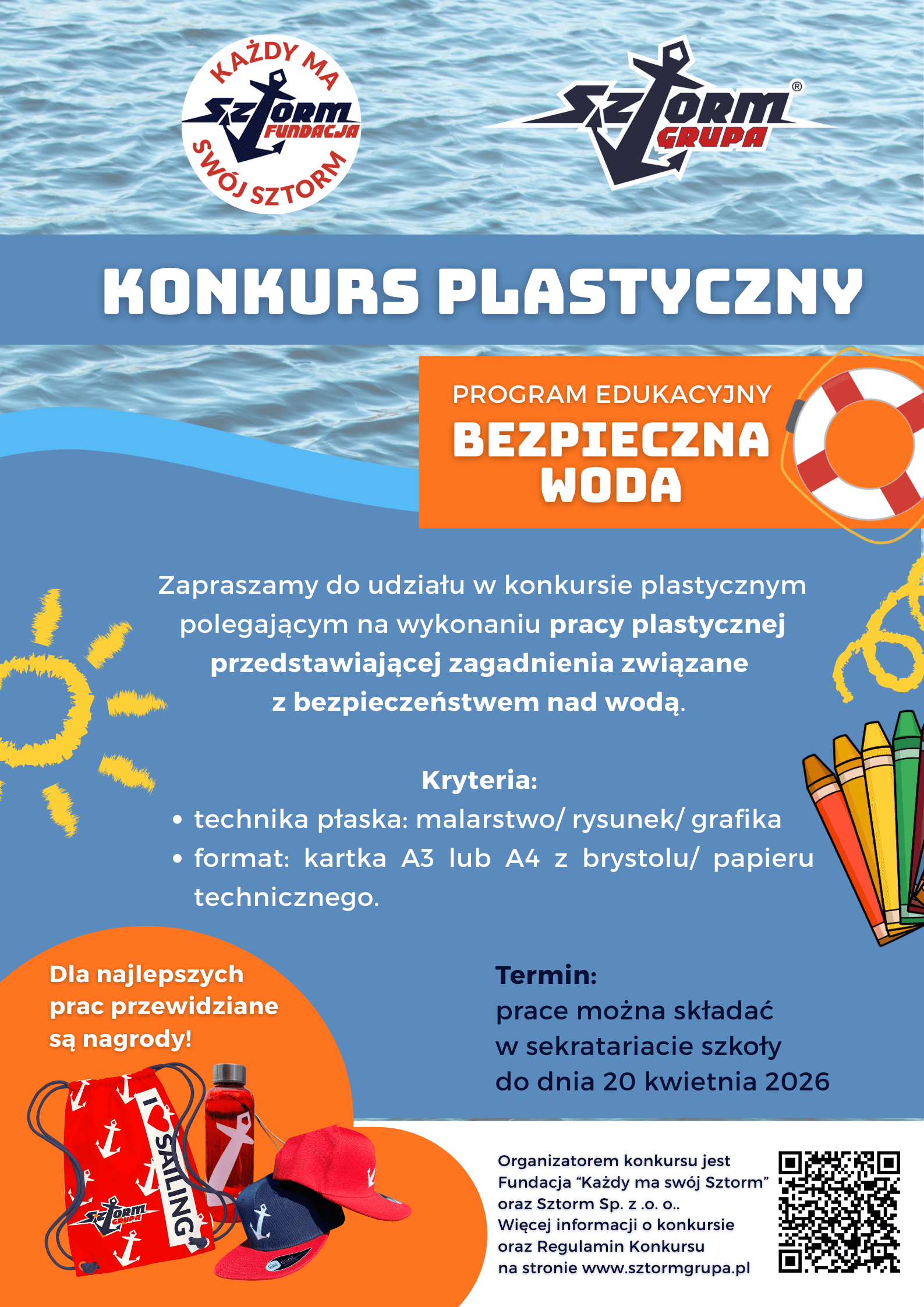 Czy wiedzieliście, że o bezpieczeństwie nad wodą można nie tylko słuchać, ale też... opowiedzieć pędzlem, kredką lub ołówkiem? Zapraszamy wszystkich uczniów szkół podstawowych do udziału w wyjątkowym konkursie plastycznym organizowanym przez Sztorm Grupę! ⚓
